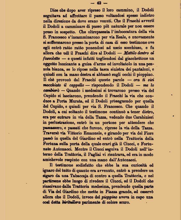 Il testimone sodisfatto che ebbe la sua curiosità ed ignaro del tutto di quanto era avvenuto, entrò a prendere un sigaro da una Tabaccaia di contro a quella Trattoria, e nel partirsene ebbe luogo di rivedere il Ciucci, ed il Dodoli che riuscivano dalla Trattoria medesima, prendendo quella parte di Via del Giardino che mette in Piazza grande, ed osservò allora che il Dodoli, invece del pioppino aveva in capo una così detta birituUera parimente di colóre scuro.