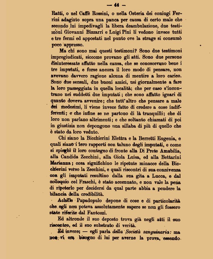 Ratti, o nel Caffè Rossini, o nella Osteria dei coniugi Ferrini adagiato sopra una panca per causa di certo male che secondo lui impedivagli la libera deambulazione, due testimóni Giovanni Bizzarri e Luigi Pini li vedono invece tutti e tre fermi ed appostati nel punto ove la strage si consumò poco appresso.