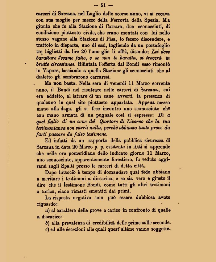Ma non basta. Nella sera di venerdì 11 Marzo corrente anno, il Bondi nel rientrare nelle carceri di Sarzana, cui era addetto, al latrare di un cane avvertì la presenza di qnalcuno in quel sito piuttosto appartato. Appena messo mano alla daga, gli si fece incontro uno sconosciuto che con mano armata di un pugnale così si espresse: Dì a quel figlio di un cune dal Questore di Livorno che la tua testimonianza non varrà nulla, perchè abbiamo tante prove da farti passare da falso testimone.