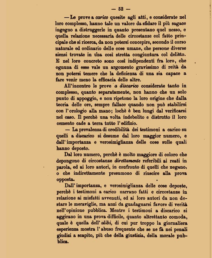 Dall'importanza, e verosimiglianza delle cose deposte, perchè i testimoni a carico narrano fatti e circostanze in relazione ai misfatti avvenuti, ed ai loro autori da non destare le meraviglie, ma anzi da guadagnarsi favore di verità nell'opinione pubblica. Mentre i testimoni a discarico si aggirano in una prova difficile, quanto altrettanto comoda, quale è quella dell' alibi, di cui pur troppo la giornaliera esperienza mostra l'abuso frequente che se ne fa nei penali giudizi a scapito, più che della giustizia, della morale pubblica.