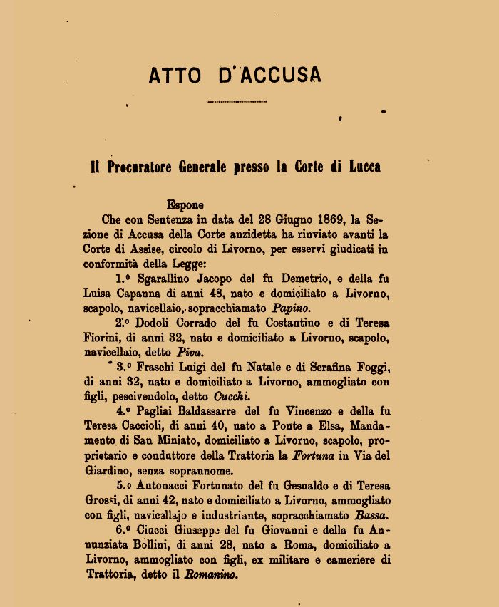 6.° Ci acci Giuseppa del fu Giovanni e della fu Annunziata Bollini, di anni 28, nato a Roma, domiciliato a Livorno, ammogliato con figli, ex militare e cameriere di Trattorìa, detto il Romanino.