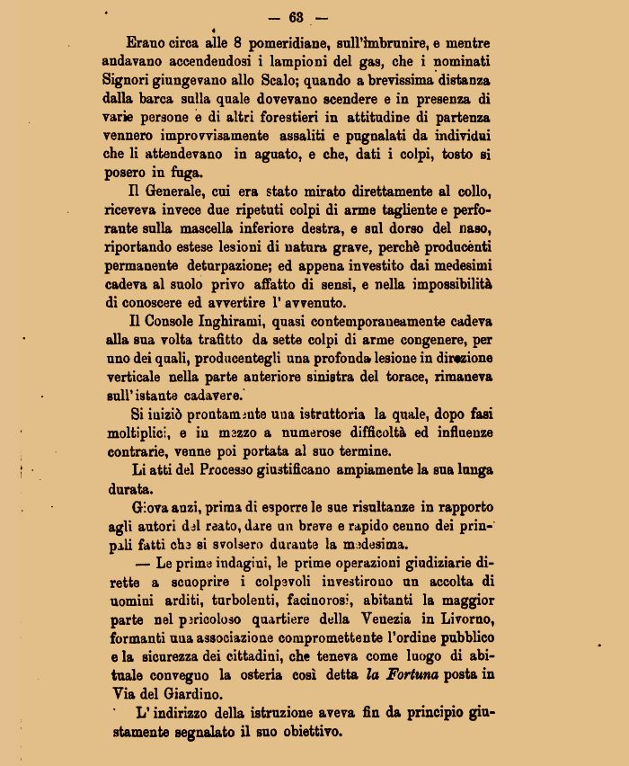 — Le prima indagini, le prime operazioni giudiziarie dirette a scuoprire i colpa voli investirono un accolta di uomini arditi, turbolenti, facinorosi, abitanti la maggior parte nel pjricoloso quartiere della Veuezia in Livorno, formanti uua associazione compromettente l'ordine pubblico e la sicurezza dei cittadini, che teneva come luogo di abituale convegno la osteria così detta la Fortuna posta in Via del Giardino.