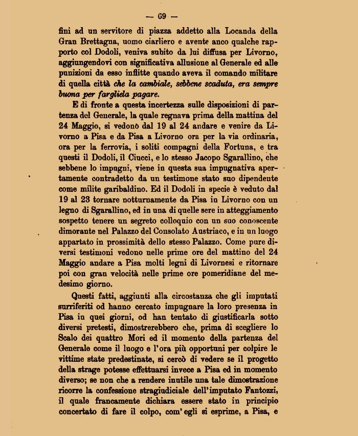E di fronte a questa incertezza sulle disposizioni di partenza del Generale, la quale regnava prima della mattina del 24 Maggio, si vedono dal 19 al 24 andare e venire da Livorno a Pisa e da Pisa a Livorno ora per la via ordinaria, ora per la ferrovia, i soliti compagni della Fortuna, e tra questi il Dodoli, il Ciucci, e lo stesso Jacopo Sgarallino, che sebbene lo impugni, viene in questa sua impugnativa apertamente contradetto da un testimone stato suo dipendente come milite garibaldino. Ed il Dodoli in specie è veduto dal 19 al 23 tornare notturnamente da Pisa in Livorno con un legno di Sgarallino, ed in una di quelle sere in atteggiamento sospetto tenere un segreto colloquio con un suo conoscente dimorante nel Palazzo del Consolato Austriaco, e in un luogo appartato in prossimità dello stesso Palazzo. Come pure diversi testimoni vedono nelle prime ore del mattino del 24 Maggio andare a Pisa molti legni di Livornesi e ritornare poi con gran velocità nelle prime ore pomeridiane del medesimo giorno.