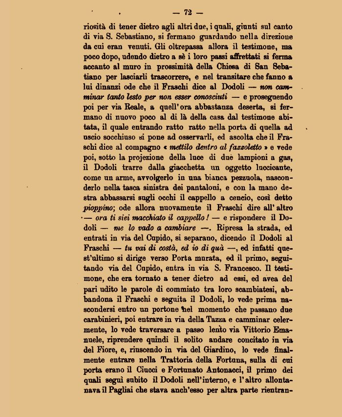 riosità di tener dietro agli altri due, i quali, giunti sul canto di via S. Sebastiano, si fermano guardando nella direzione da cui eran venuti. Gli oltrepassa allora il testimone, ma poco dopo, udendo dietro a sè i loro passi affrettati si ferma accanto al muro in prossimità della Chiesa di San Seba-tiano per lasciarli trascorrere, e nel transitare che fanno a lui dinanzi ode che il Fraschi dice al Dodoli — non camminar tanto lesto per non esser conosciuti — e proseguendo poi per via Beale, a quell' ora abbastanza deserta, si fermano di nuovo poco al di là della casa dal testimone abitata, il quale entrando ratto ratto nella porta di quella ad uscio socchiuso si pone ad osservarli, ed ascolta che il Fraschi dice al compagno « mettilo dentro al fazzoletto * e vede poi, sotto la proiezione della luce di duè lampioni a gas, il Dodoli trarre dalla giacchetta un oggetto luccicante, come un arme, avvolgerlo in una bianca pezzuola, nasconderlo nella tasca sinistra dei pantaloni, e con la mano destra abbassarsi sugli occhi il cappello a cencio, coś detto pioppino; ode allora nuovamente il Fraschi dire all' altro — ora ti siei macchiato il cappello ! — e rispondere il Dodoli — me lo vado a cambiare —. Ripresa la strada, ed entrati in via del Cupido, si separano, dicendo il Dodoli al Fraschi — tu vai di costà, ed io di qua —, ed infatti quest'ultimo si dirige verso Porta murata, ed il primo, seguitando via del Cupido, entra in via S. Francesco. Il testimone, che era tornato a tener dietro ad essi, ed avea del pari udito le parole di commiato tra loro scambiatesi, abbandona il Fraschi e seguita il Dodoli, lo vede prima nascondersi entro un portone liei momento che passano due carabinieri, poi entrare in via della Tazza e camminar celermente, lo vede traversare a passo lento via Vittorio Emanuele, riprendere quindi il solito andare concitato in via del Fiore, e, riuscendo in via del Giardino, lo vede finalmente entrare nella Trattoria della Fortuna, sulla di cui porta erano il Ciucci e Fortunato Antonacci, il primo dei quali segú subito il Dodoli nell'interno, e l'altro allontanava il Pagliai che stava anch'esso per altra parte rientran-