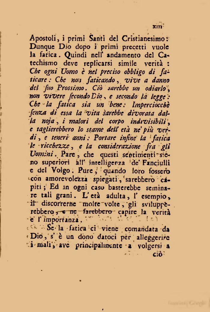 Apostoli, i primi Santi del Cristianesimo: Dunque Dio dopo i primi precetti vuole la fatica. Quindi ndi' andamento del Catechismo deve replicarsi simile verità : Che ogni Uomo è nel preciso obbligo di faticare : Che non faticando, -vive a danno del fuo Prossimo. Ciò sarebbe un odiarlo, non vivere fecondo Dìo, e secondo la legge Che la fatica sia un bene: Imperciocché fenza di essa la vita Sarebbe divorata dalla »qja, i malori del corpo indivisibili, e tagiterebbero lo stame dell' età ne più verdi , e teneri anni : Portare infine la fatica te ricchezze, e la considerazione fra gli Uomini..Pare, che questi ssntimcnti-^é-no superiori all' intelligerza de' Fanciulli e del Volgo. Pure, quando loro fossefo con amorevole^?.! spiegati,'sarebbero capiti ; Ed in ogni caso basterebbe seminare tali grani. L'età adulta, 1' esempio, it~' discorrerne molte volte, gli svilupperebbero,^ -ne farebbero capire la verità e' f Importanza. '•'•*• '•• '