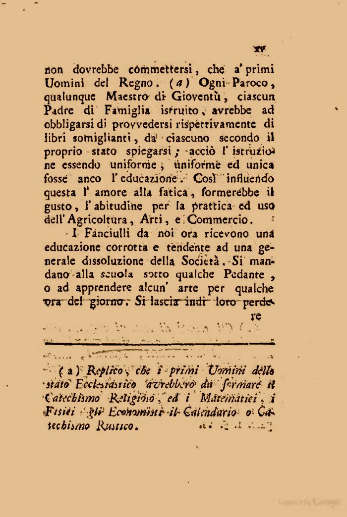 l Fanciulli da nói ora ricevono una educazione corrotta e tendente ad una generale dissoluzione della Società, Si mandano ìlla scuola sotto qualche Pedante , o ad apprendere alcun' arte per qualche ora del giorno-. Si iascii indi' loro perdei