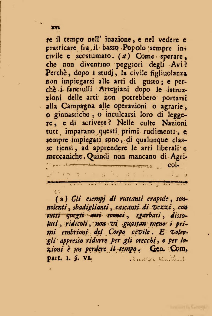 re il tempo ned' inazione, e nel vedere e praticare fra.il casso Pojolo sempre incivile e scostumato, (a) Come sperare, che non diventino peggiori degli Avi? Perchè, dopo i studj, la civile fsgliuolar.za non impiegarsi alle arti di gusto; e perchè i fanciulli Artegiani dopo le istruzioni delle arti r.on potrebbero portarsi alla Campagna alle op:razioni o agrarie, 0 ginnastiche , o inculcarsi loro di leggere, e di scrivere ? Nelle eulte Nazioni tutt imparano questi primi rudimenti, e sempre impiegati sono. di qualunque classe nensi, ad apprendere le arti liberali e meccaniche. Qu.ua1 non mancano di Agri-¦........—---_ Col-