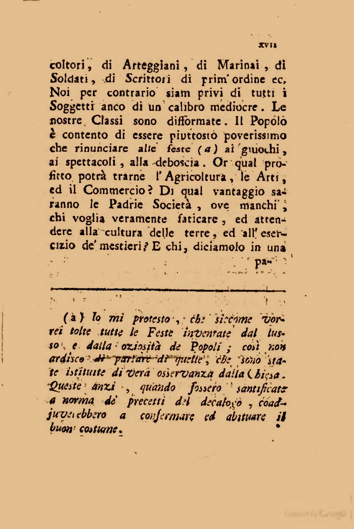coltori, di Arteggiani , di Marinai , dì Soldati, di Scrittoti di prim'ordine ec. Noi per contrario siam privi di tutti i Soggetti anco di un calibro mediocre. Le nostre Classi sono difformate. Il Popolo è contento di essere piuttosto poverissimo che rinunciare alle' feste (a ) ai giuochi, ai spettacoli, alla deboscia . Or qual profitto potrà trarne I' Agricoltura , ie Arti, ed il Commercio? Di qual vantaggio saranno le Padrie Società , ove manchi , chi voglia veramente faticare , ed attendere alla-cultura delle terre, ed all'esercizio de' mestieriE chi, diciamolo in una
