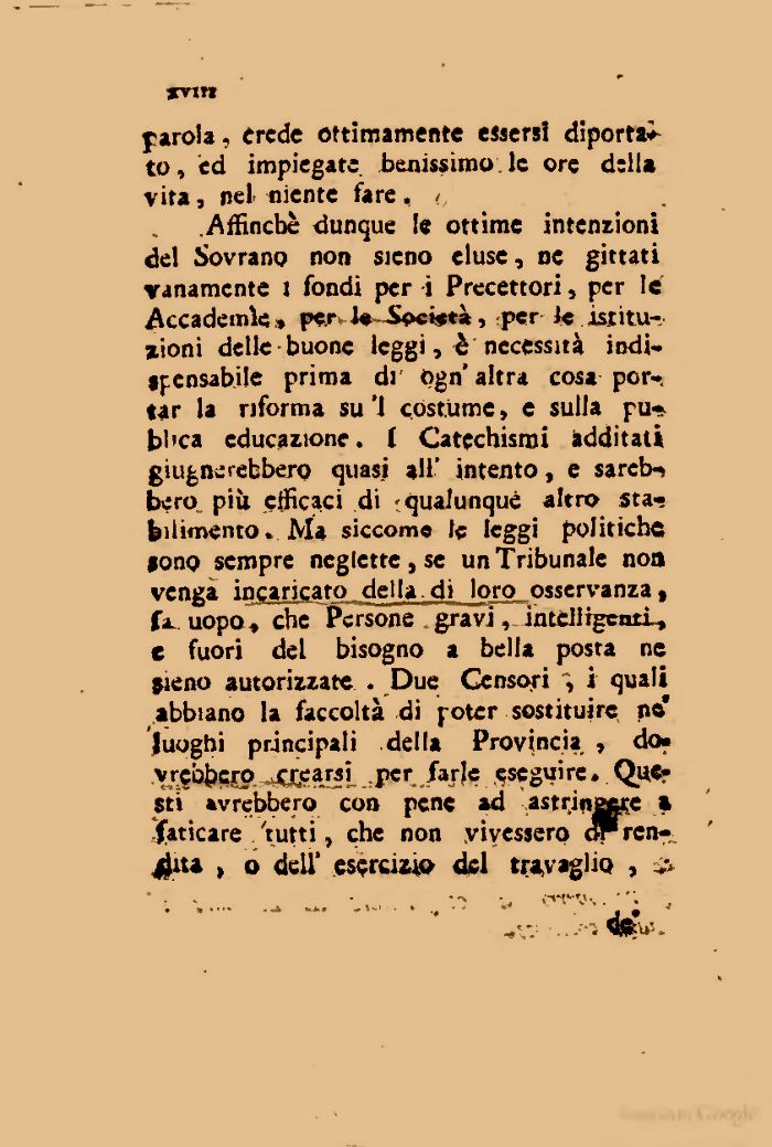 Affinchè dunque le ottime intenzioni del Sovrano non sieno eluse, ne gittati vanamente i fondi per ì Precettori, per le Accademie, pcr-J* -Società, per )« istituzioni delle buone leggi, è necessità indi-ifensabile prima di ogn' altra cosa portar la riforma su'J costume, e sulla pubica educazione. ( Catechismi additati ghignerebbero quasi all' intento, e sarctn bero più efficaci di • qualunque altro stabilimento . Ma siccome le leggi politiche lono sempre neglettele un Tribunale non venga incaricato della di loro osservanza t fa uopo, che Persone gravi, intelligenti, c fuori del bisogno a bella posta ne jieno autorizzate . Due Censori i quali abbiano la faccoltà di poter sostituire ne' luoghi principali della Provincia , dovrebbero crearsi per farle eseguire. QuCr Sti avrebbero con pene ad astringere a faticare tutti, che non vivessero orren-> o deli' escrcmo dei travaglio , v.