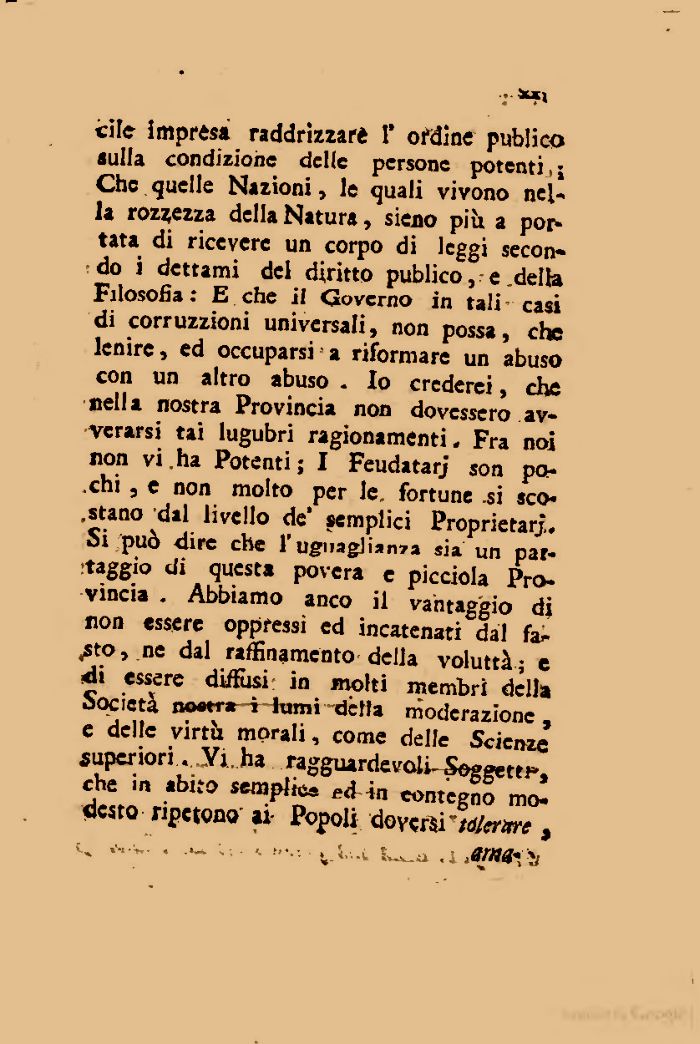 «ite imprésa raddrizzare 1' ordine publico sulla condizione delle persone potenti, ; Che quelle Nazioni, le quali vivono nella rozzezza della Natura, sieno più a portata di ricevere un corpo di leggi secondo i dettami del diritto publico, e della Filosofia : E che il Governo in tali casi di corruzzioni universali, non possa, che lenire, ed occuparsi a riformare un abuso con un altro abuso . Io crederei, che nella nostra Provincia non dovessero avverarsi tai lugubri ragionamenti. Fra noi non vi ha Potenti ; I Feudatarj son pochi , e non molto per le fortune si scostano dal livello de' semplici Proprietarj,. Si può dire che l'uguaglianza sia un par-taggio di questa povera e picciola Provincia . Abbiamo anco il vantaggio di non tssere oppressi ed incatenati dal fa-sto, ne dal raffinamento della voluttà; e di essere diffusi in molti membri della Società omit« i lumi della moderazione , e delle virtù morali, come delle Scienze superiori. Vi, ha ragguardevoli- Soggetti», che in abito semplice ed 4n contegno modesto ripetono' li- Popoli doversi tólcritrc ,