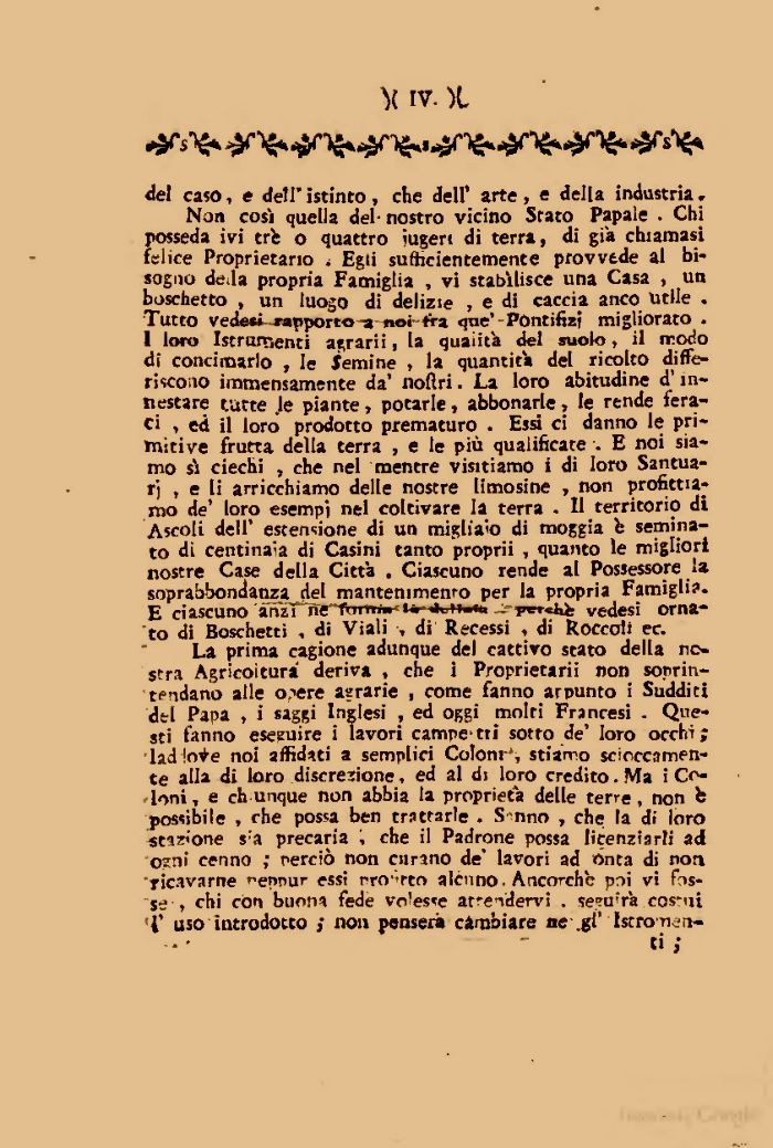 Non cosi quella del-nostro vicino Srato Papale . Chi posseda ivi trfe o quattro iugen di terra, di già chiamasi felice Proprietario * Egli suffccientemente provvede al bisogno deila propria Famiglia , vi stabilisce una Casa , un boschetto , un luogo di delizie , e di caccia anco utile . Tutto vederi -rapporto-a-«oi-«ra qne' POntifizj migliorato . 1 loro Istrorrienti agrarii, la qualità del suolo, il irotio di concimarlo , le Semine , la quantità del ricolto differiscono immensamente da' noftri. La loro abitudine d'innestare tutte .le piante , potarle , abbonarle , le rende feraci , ed il loro prodotto prematuro . Essi ci danno le primitive frutta della terra , e le più qualificate . E noi siamo sì ciechi , che nel mentre visitiamo i di loro Santuari , e li arricchiamo delle nostre limosine , non profittiamo de' loro esempì nel coltivare la terra . Il territorio di Ascoli dell' estensione di un migliaio di moggia h seminato di centinaia di Casini tanto proprii , quanto le migliori nostre Case della Città . Ciascuno rende al Possessore la soprabbondanza del mantenimenro per la propria Famigli?. E ciascunovedesi ornato di Boschetti , di Viali -, di Recessi , di Roccoli ec.