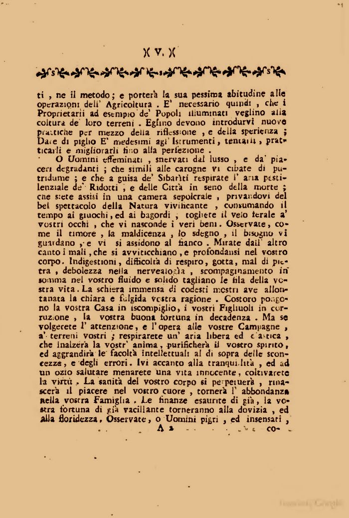 O Uomini effeminati , snervati dal lusso , e da' piaceri degradanti ; che simili alle carogne vi cibate di putridume ; e che a guisa de' Sibariti respirate 1* aria ptsti-lenziale de Ridotti , e delle Città in seno della morte ; cne siete assisi in una camera sepolcrale , privandovi del bel spettacolo della Natura vivificante , consumando il tempo ai giuochi, ed ai bagordi , togliete il velo ferale a' vostri occhi , che vi nasconde i veri beni. Osservate» come il timore , la maldicenza , lo sdegno , il bisogno vi guardano e vi si assidono al fianco . Mirate dall' altro canto i mali,che si avviticchiano , e profondami nel vostro corpo. Indigestioni, difficoltà di respiro, gotta, mal di pietra , debolezza nella nervealosìa , scompaginamento in somma nel vostro fluido e solido tagliano le fila della vostra vita. La schiera immensa di codesti mostri ave allontanata la chiara e fulgida vestra ragione . Costoro pongono la vostra Casa in iscompiglio, i vostri Figliuoli in corruzione , la vostra buona iortuna in decadenza . Ma se volgerete i' attenzione, e l'opera alle vostre Campagne , a' terreni vostri ; respirarete un' aria libera ed e astica , che inalzerà la vostr' anima, purificherà il vostro spirito, ed aggrandirà le facoltà intellettuali al di sopra delle sconcezze, e degli errori. Ivi accanto alla tranqui.htà , ed ad un ozio salutare menarete una vita innocente, coltivante la virtù , La sanità del vostro corpo si perpetuerà , rinascerà il piacere nel vostro cuore , tornerà P abbondanza nella vostra Famiglia . Le finanze esaurite di già, la vostra fortuna di già vacillante torneranno alla dovizia , ed alla floridezza. Osservate, o Uomini pi^ri , ed insensati }