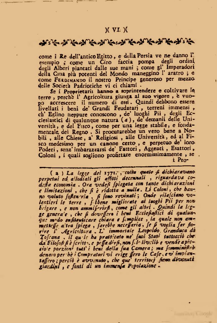 come i Re dell'antico Egitto » e della Persia ve ne danno r esempio » come un Ciro faccia pompa degli ordini degli Alberi piantati dalle sue mani ; come gì' lmperadori della Cina più potenti del Mondo maneggino I' aratro ; e come Ferdinando il nostro Principe generoso per mezzo delle Società Padriotiche vi ci chiami -
