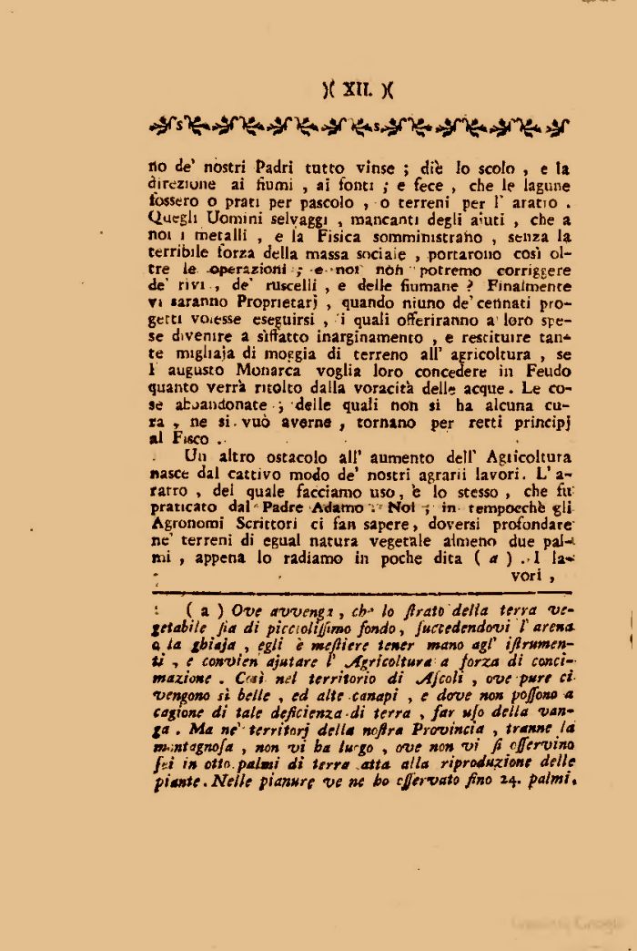 (a ) Ove avventi, eh-* lo fi rato delia terra vegetabile jia di picctoltjfimo fondo, fuccedendovi f arenati la gbitja, egli è meftiere tener mano agi' ifirumen-ù , e convien ajutare I' jf^ricoltura a forza di conci--mazione . Cai nel territorio di e dove non poffono a cagione di tale deficienza di terra , far ufo della vanga . Ma ne territori dell4 nofira Provincia , tranne Ia m-:ntagnofa , non vi ha lu-go , ave non vi fi cffervina [zi in otto palati di terra aita, alla riproduzione delle piante. Nelle pianure ve ne bo cjfervato fino 24. palmi*