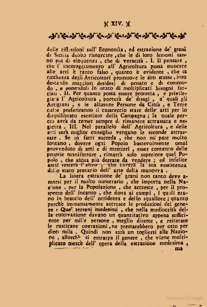 delle riflessioni sali1 Economìa, ed estrazione de' grani di Sicilia debbo rimarcare ,che le di loro lezioni sanno pia di eloquenza , che di veracità . I. Il pensare , che i' incoraggiamento all' Agricoltura possa nuocere alle arti fc tanto falso , quanto è evidente , che ia ricchezza degli Agricoltori promuove le arti stesse, loro desta rido maggiori desideri di ornato e di commodo , e ponendoli in' istato di moltiplicati bisogni fattizi! . II. Per quanto possa essere proretta , e priviler giara l* Agricoltura « porterà de' disagi , a' quali gli Artigiani , e le allussite Persone da Citta , e Terre eulte preferiranno il casareccio stare delle' arti per lo disquilibrato esercizio della Campagna ; la quale perciò avrà da temer sempre di rimanere attrassata e ne? gletta . III. Nel parallelo dell' Agricoltura , e delle arri sarà miglior consiglio vengano le seconde attras-sate . Se in fatti- succeda , che non mi pare motto lontano , dovere ogni Popolo bastevolmente ornai provveduto di arti e di mestieri , esser contento delle proprie manifatture , rimarra solo superiore quel Popolo , che abbia più derrate da vendere ; ed infelice assai resterà P altirv-y-the caverà la sua sussistenza dallo stato precario dell' arte della manovra .