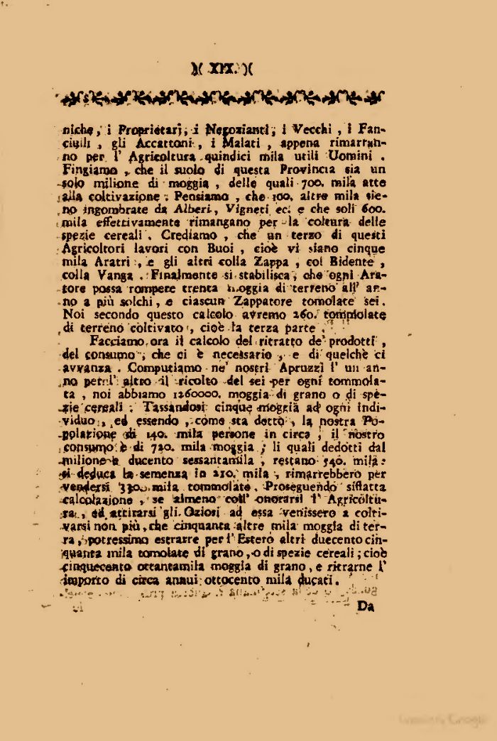 Facciamo.ora il calcolo del ritratto de* prodotti , del consumo , che ci fe necessario -, -e di'quelchè Ci avvanza . Computiamo ne' nostri Apruzsì 1' un art-.po petr.r j»itto -il Scolto -del tei -per ogni tombolata , noi abbiamo uifoooo. moggia di grano o d> spé-jpje cereali ; Tassandosi cinque