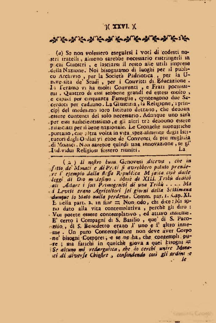 (a) Ss non volessero eseguirsi i voti di codesti nostri «rateili ! almeno sarebbe necessario ristringerli in p-.yciii Chiostri , e lasciarsi il resto alle utili imprese .della Nazione. Noi bisogniamo di luoghi per il public co Archivio , per la Società Padriotica , pei' la U-n.ve sita de1 Scudi > per i Convitti di-Educazione . l i Teramo vi ha molti Conventi , e JFmi pochissimi . Quattro di essi sebbene grandi ed estest moito , e capaci per cinquanta Famiglie, contengono due Sacerdoti pei cadauno. LaGiustieia.t la Religione, iprincipi del medes.mo loro Istituto dettano, che deooan -essere contenti del solo necessario. Aduuque uno sarà par essi suadentissimo, e gli altri tri deooono essere -niasciati penicene nazionale, Le Cronache monastiche ^portano,cne pltra volta in vita.spezialmente degli Isti« .tutori degli O-iliaiyi eboe de Conventi di più migliaia -di Monaci. Non sarebbe quindi una innovazione , se gì' .-J^d.vidui Religiosi fossero riuniti. La