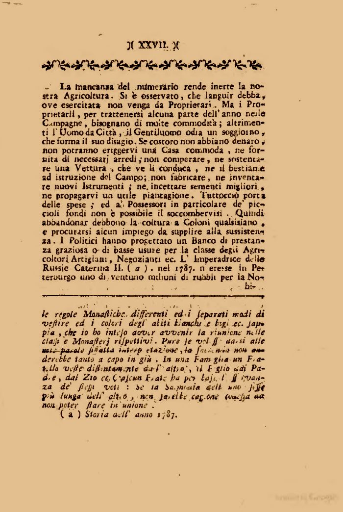 La tnancànjsa del .nUmertriO rende inerte la nostra Agricoltura. Si h osservato) che languir debba* ove esercitata non venga da Proprietari.. Ma i Proprietarii, per trattenersi alcuna parte dell'anno neile Campagne, bisognano di molte commodità ; altrimenti 1'Uomo da Città , il Gentiluomo odia un soggiorno, che forma il suo disagio. Se costoro non abbiano denaro * non potranno enggervi una Casa commoda i ne fornita di necessari arredi,1 non comperare, ne sostentare una Vettura , che ve li conduca , ne li bestiame ad istruzione del Campo; non fabricare, ne inventa-re nuovi Istruraenti ; ne. incettare sementi migliori » ne propagarvi un utile piantagione. Tuttocciò porta delle spese ; ed a'. Possessori in particolare de' piccioli fondi non è possibile il soccombervi!! . Quindi abbandonar debbono la coltura a Coloni qualsisiano « e procurarsi alcun impiego da supplire alla sussistenza . 1 Politici hanno progettato un Banco di prestai* za graziosa (y di basse usure per la classe degli Agri* coltori Artigiaai, Negozianti ec. L' Imperadrice dello Russie Caterina II. I a ) . nel 1787. n eresse in Per terourgo uno di, ventuno mdiuni di rubbli per iaNo-: . - , hi-..