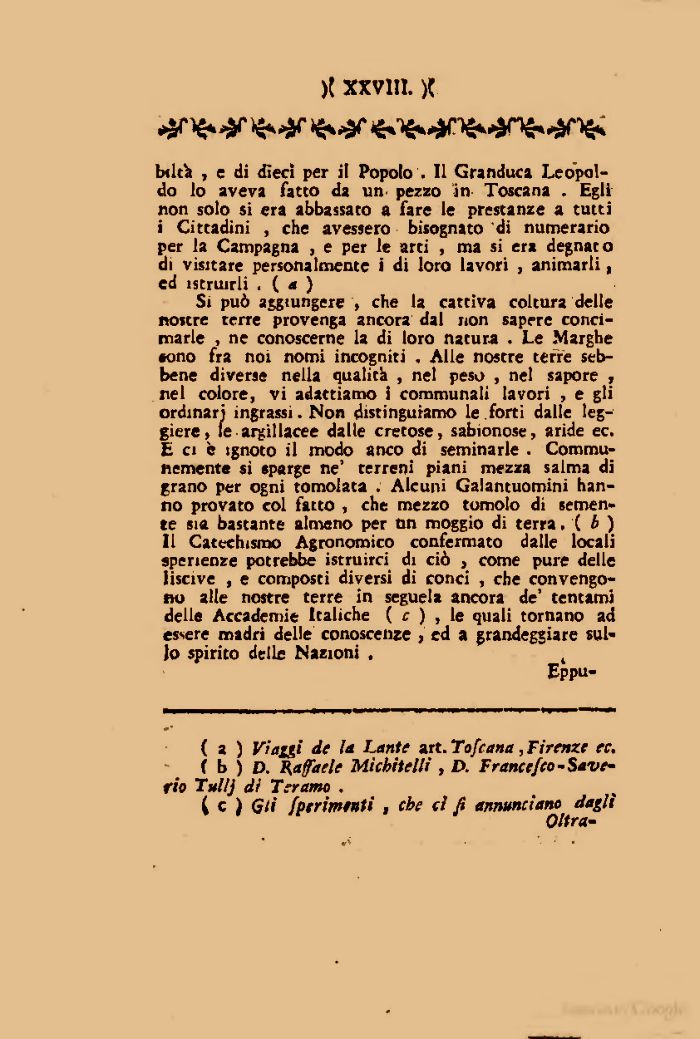 Si può aggiungere > che la cattiva coltura delle nostre terre provenga ancora dal non sapere concimarle , ne conoscerne la di loro natura . Le Marghe tono fra noi nomi incogniti , Alle nostre terre sebbene diverse nella qualità , nel peso , nel sapore » rei colore, vi adattiamo i communali lavori , e gli ordinari ingrassi. Non distinguiamo le forti dalle leggiere, le argillacee dalle cretose, sabionose, aride ec. E ci è ignoto il modo anco di seminarle . Commuti e mente si sparge ne' terreni piani mezza salma di grano per ogni tomolata . Alcuni Galantuomini hanno provato col fatto , che mezzo tomolo di semente sia bastante almeno per nn moggio di terra, ( b ) Il Catechismo Agronomico confermato dalle locali sperienze potrebbe istruirci di ciò , come pure delle liscive , e composti diversi di conci , che convengono alle nostre terre in seguela ancora de' tentami delle Accademie Italiche ( c ) , le quali tornano ad essere madri delle conoscenze , ed a grandeggiare sullo spirito delle Nazioni . 4