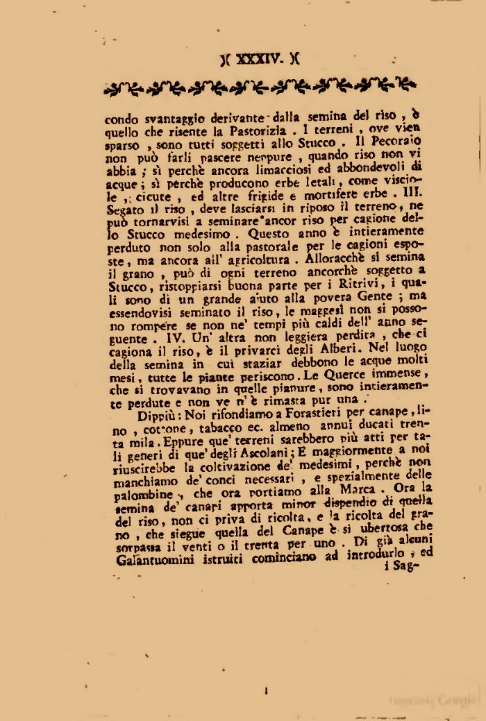 Dippiù : Noi rifondiamo a Forastieri per canape, lino , corone, tabacco ec. almeno annui ducati trenta mila. Eppure que' terreni sarebbero più atti r tali generi di que'degli Ascolani ; E maggiormente a noi riuscirebbe la coltivazione de1 medesimi, perchè non manchiamo de' conci necessari , e spezialmente delle palombine -, che ora rortiamo alla Marca . Ora la semina de' canapi apporta minor dispendio dt quella del riso, non ci priva di ricolta, e la ricolta del grano , che siegue quella dei Canape è si ubertosa che sorpassa il venti o il trenta per uno . I>i già alcuni Galantuomini istruiti cominciano ad introdurlo , ed