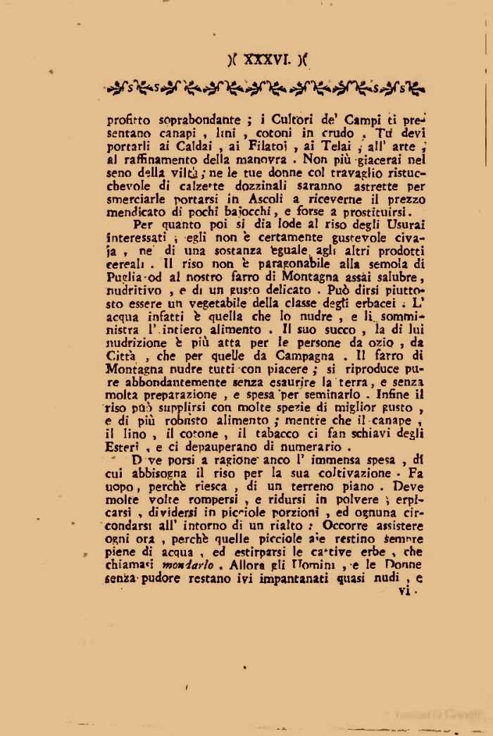 Per quanto poi si dia lode al riso degli Usurai interessati egli non e certamente gustevole civaia , ne di una sostanza teguale agli altri prodotti cereali . Il riso non e paragonabile alla semola di Puglia-od al nostro farro di Montagna assai salubre, nudritivo , e di un ?usto delicato . Può dirsi piuttosto essere un vegetabile della classe degti erbacei ; L* acqua infatti è quella che lo nudre , e li. somministra 1*,intiero alimento . Il suo succo , la di lui ìiudrizione è più atta per le persone da ozio , da Città , che per quelle da Campagna . Il farro di Montagna nudre tutti con piacere ; si riproduce pure abbondantemente senza esaurire la terra, e senza molta preparazione , e spesa 'per seminarlo - Infine il riso pQò supplirsi con molte specie di miglior gusto , e di più robusto alimento ; mentre che il canape , il lino , il cotone , il tabacco ci fan schiavi degli Estprt , e ci depauperano di numerario .