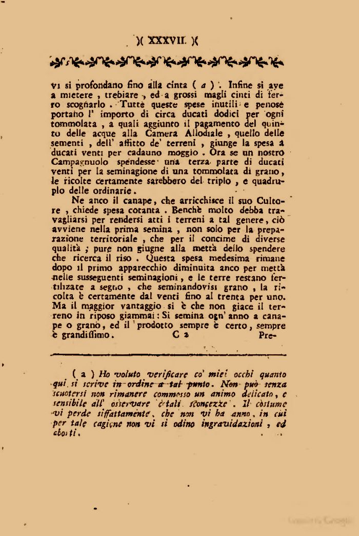 Ne anco il canape, che arricchisce il suo Cultore , chiede spesa cotanta . Benchfe molto debba travagliarsi per rendersi atti i terreni a tal genere, ciò avviene nella prima semina , non solo per la preparazione territoriale , che per il concime di diverse qualità ; pure non giugne alia metta dello spendere che ricerca il riso . Questa spesa medesima rimane dopo il primo apparecchio diminuita anco per mettà nelle susseguenti seminagioni, e le terre restano fer-tilizate a segno , che seminandovisi grano , la ricolta b certamente dal venti fino al trenta per uno. Ma il maggior vantaggio si è che non giace il terreno in riposo giammai : Si semina ojn' anno a canape o granò, ed il'prodotto sempre è certo, sempre fe grandiflìmo. C a Pre-