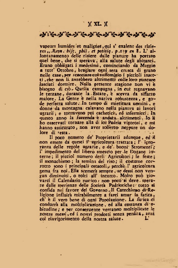 Il poco numero de' Proprietarii adunque , ed H *ion essere da questi i'-agricolcura trattata ; F ignoranza delle regole agrarie, e de\ buoni Stromenti; 1' impedimento del libero smercio per -le Dogane irf-terne ; il picciol numero deM>_ Agricoltori; le feste; il monachismo; la semina del riso; il costume corrotto sono i principali ostacoli^ perchè.I' agricoltura gema fra noi. Ella scemerà sempre ,-se deisi non ven-gan diminuitilo tolti all' intutto. Molto può giovarci il Calendario rusrico.- non poco'si deve sperare dalle sperienze delle Società Padrk>tiche::' tutto si confida nel favore dei Governo -Il Catechismo di-Religione influirà mirabilmente a farci amar la farica, eh' h il vero bene di ogni Popolazione-. La faticaci condurrà alla moltiplicazione, ed alla costanza di a-bitudtne; e per conseguente verranno moltiplicate le nostre messi,ed i nostri prodotti senza perditar anzi col rinvigorimento della nostra salute. L'