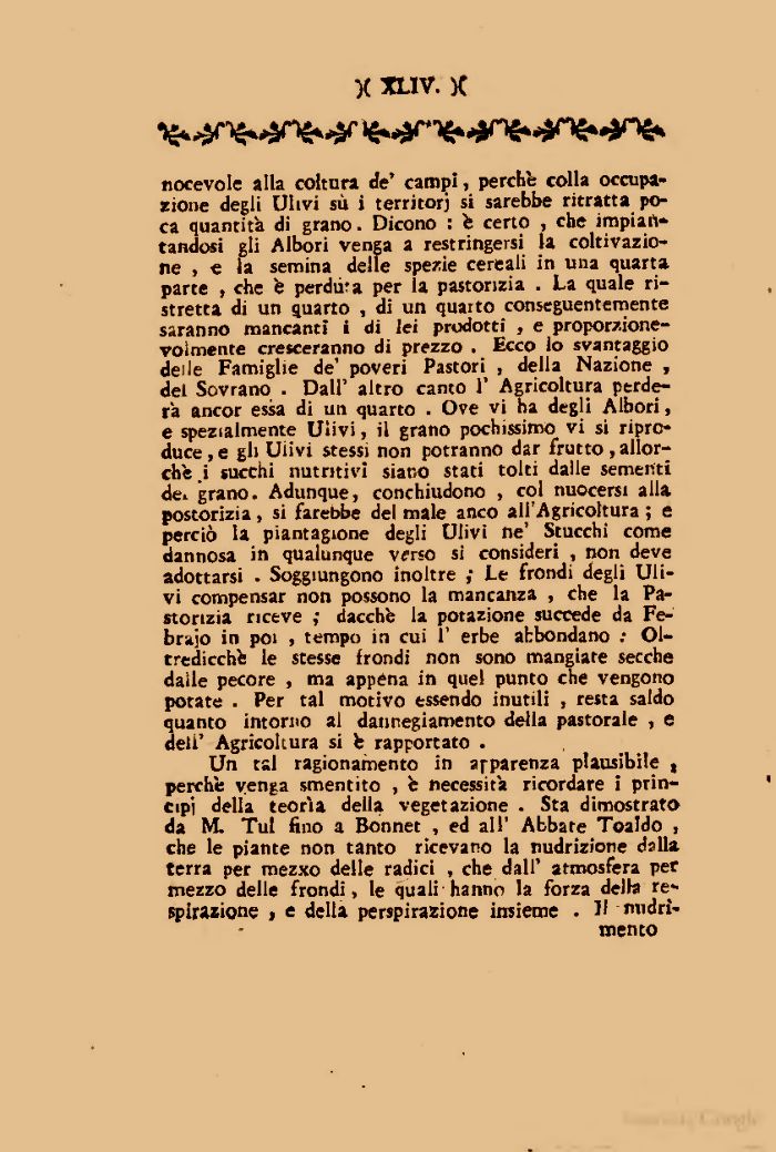 nocevole alla coltura de' campi, perchè colla occupazione degli Ulivi su i territori si sarebbe ritratta poca quantità di grano. Dicono : b certo , che impiantandosi gli Albori venga a restringersi la coltivazione , e fa semina delle spezie cereali in una quarta parte , che è perdura per la pastorizia . La quale ristretta di un quarto , di un quarto conseguentemente saranno mancanti i di lei prodotti , e proporzione-volmente cresceranno di prezzo . Ecco lo svantaggio delle Famiglie de1 poveri Pastori , della Nazione , del Sovrano . Dall' altro canto 1' Agricoltura perderà ancor essa di un quarto . Ove vi ha degli Albori, e spezialmente Ulivi, il grano pochissimo vi si riproduce , e gli Uiivi stessi non potranno dar frutto , allorché.i succhi nutritivi siano stati tolti dalle sementi de. grano. Adunque, conchiudono , col nuocersi alla postorizia, si farebbe del male anco all'Agricoltura ; e perciò la piantagione degli Uiivi ne' Stucchi come dannosa in qualunque vrrso si consideri , non deve adottarsi . Soggiungono inoltre ; Le frondi degli Uiivi compensar non possono la mancanza , che la Pastorizia riceve ; dacché la potazione succede da Fe-brajo in poi , tempo in cui 1' erbe abbondano : OI-tredicchfe le stesse frondi non sono mangiare secche dalle pecore , ma appena in quel punto che vengono potate . Per tal motivo essendo inutili , resta saldo quanto intorno al dannegiamento della pastorale , e deli' Agricoltura si b rapportato .