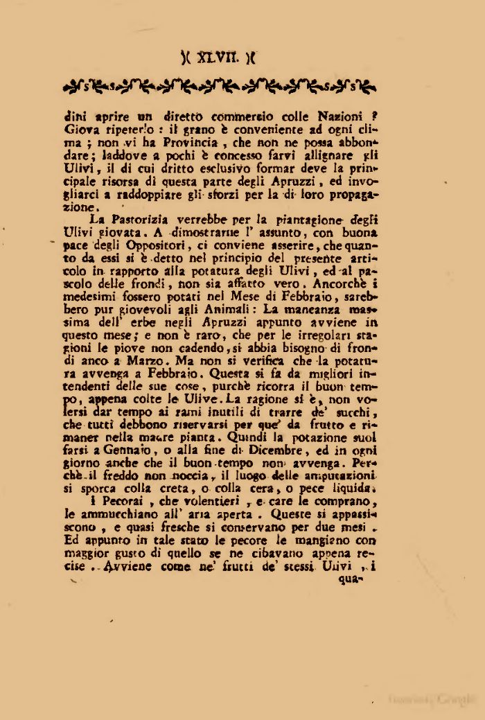 dini aprire un diretto commercio colle Nazioni ? Giova ripeterlo : il grano fe conveniente ad ogni elitra ; non .vi ha Provincia , che non ne possa abbon*-dare; laddove a pochi fe concesso farvi allignare gli Ulivi, il di cai dritto esclusivo formar deve la prin* cipale risorsa di questa parte degli Apruzzi, ed invogliarci a raddoppiare gli sforzi per la di loro propagazione .