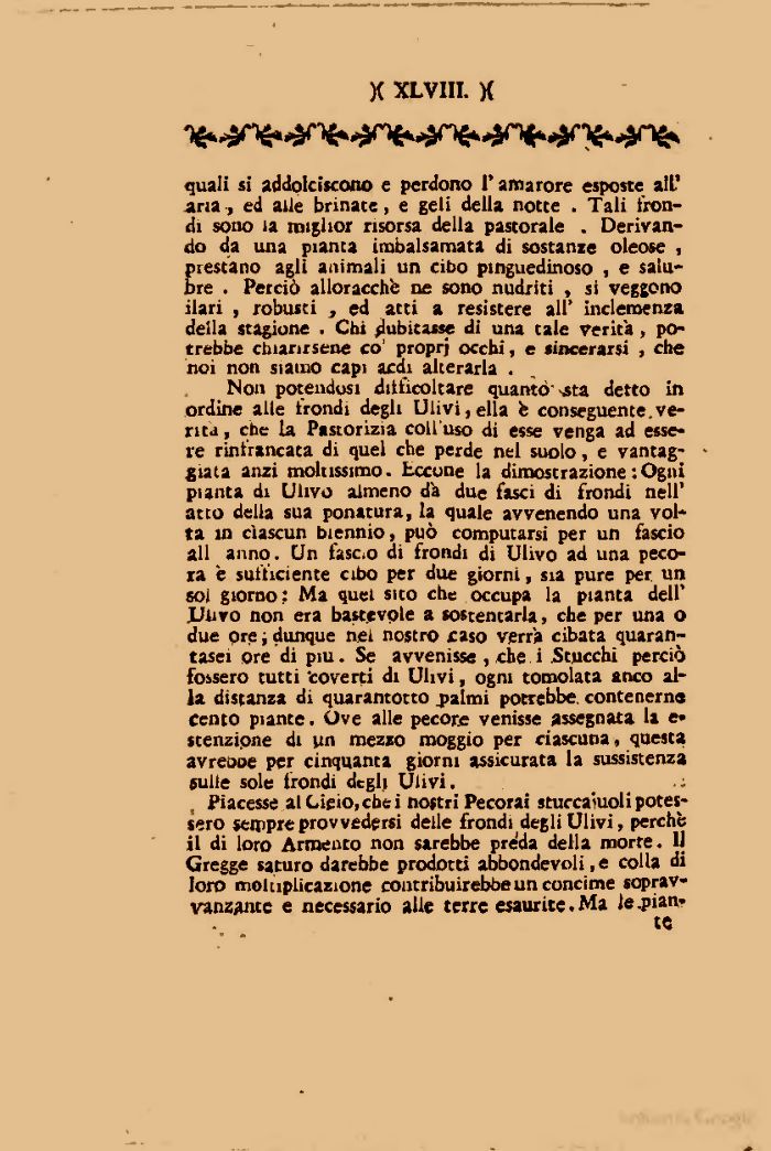 Non potendosi diiiìcoltare quanto ^sta detto in ordine alle trondi degli Ulivi,ella è conseguente.verità , che la Pastorizia coll uso di esse venga ad esseve rinfrancata di quel che perde nel suolo, e vantaggiata anzi moltissimo. Eccone la dimostrazione : Ogni pianta di Ulivo almeno dà due fasci di frondi nell' atto delia sua ponatura, la quale avvenendo una volta in ciascun biennio, può computarsi per un fascio ali anno. Un fasoo di frondi di Ulivo ad una pecora è sufficiente cibo per due giorni, sia pure per un sol giorno: Ma quel sito che occupa la pianta dell' Uhvo non era bastevole a sostentarla, che per una O due ore ; dunque nei nostro caso verrà cibata quarantasei ore di più. Se avvenisse , che i Stucchi perciò fossero tutti 'coverti di Ulivi, ogni tomolata anco alla distanza di quarantotto palmi potrebbe, contenerna Cento piante. Ove alle pecore venisse assegnata la e» scenzione di un mezzo moggio per ciascuna, questa avreooe per cinquanta giorni assicurata la sussistenza culle sole frondi degli Ulivi.