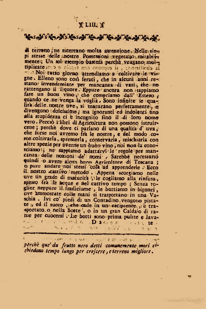 ài terreno ;ne ricercano molta attenzione>Heller sjen pi stesse ideile i^stre Possessioni :cvegeui>Oi.n»rabiK mente); Un sol.- esempio-basteià ipeicfaLveagacoi moli tiplicate ;n. o rlws^i «r>3 onoiqoi ii . if.o'siJiods» il - Noi tutto giorno attendiamo a cókiVar«4«;:*wi jne. Elleno sono cOsV feraci,che in alcuni anni-re-: stano invendemiats per mancanza di vasi», che^n© rattengano il liquoreEppureJ ancora non ; sappiamo fare un buon vino ¦/> che compriamo dall' Esteio > quando ce;ne)venga.la vòglia< Sonò infinite le .'qualità Ideile, nostre uve-, si maturano perfettamente';, :er divengono dolcissime; ma ignoranti ed indolenti fino alla stupidezza ci è incognito fìnó il di loro nomo vero. Perciò i'libri di Agricoltura non possono istruircene; perchè dove ci parlano di una quali t'a: d' « va ; che forse noi avremo fra le nostre, e dei modo co-roe.coltivarla,spremerla, conservarla mischiarla con altre spezie per «Verrte un buW vino V noi non -la conosciamo'/; ne Sappiamò adattarvi'le regolé -per mancanza; delle nozioni de' nomi ^ Sarebbè necessario quindi o.avere alcrfn bnnn Agricoltore di Toscana ; o pure andare jnoi stessi tcilà 'ad apprenderle Ecco il nostro cattivo metodo . Appena scorgiamo nelle uve un grado di maturità V'ie Cogliamo alla rinfusa, «pesto ;frà Te àcque e rtei1 cattivo tempo ; Senza toglier neppure il, fradiciume , le buttiamo in' bigonci, óve ammostate colle mani si trasportano in una Va-schia . Ivi co' piedi di un Contadino,vengono pista-te ed il succo .^ha'icode in nnoiècipient-e.è tra-¦sportato, o nella Botte o in un gran Caldaio di rame per cuocersi .he- botti sono; prima pulite e Java» ..-.(• . , <•, .Di', or . ; te -