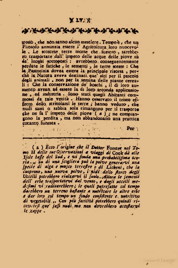 ( a ) Ecco f origine the ti D»iter Forster nel Torno Il delle sue Ofseriazioni * viaggi di Cookctó alle Jfole tajfe del Sud, e vi fonda ma prokabiìijfttxa tese ria.,, 'Hi* di una Scogliera può la polve generarvi una [pecie di alga, e mujco- terreftre o di Licheni, che la cuoprono, una nuova polve y i nidì dello fieno degli Uccelli potrebbero rialzarvi (1 fuolo. Alter* le iementi dell' erbe ira/portatevi dal. vento, e dagli uccelli medimi vi rtdifaubbero ; le quali putrefatte col tempo darebbero un terrene baftante a nutricare le altre erbe e dar lorp .col tempo un fondo confi/lente e. nutritiva di vegetati li, „ Con più facilità potrebbero quindi ri-cov ir/i .qvf jatfi nudi; ma non dovrebbero accodarvi le zappe .