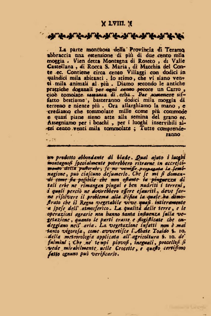 La parte montuosa deflà' Provincia di Teramo abbraccia nna estensione di più dì due cento mila moggia . Vien detta Montagna di Roseto , di Valle Castellana , di Rocca S. Maria, di Macchia del Conte ec. Contiene circa cento Villaggi con dodici in quindici mila abitanti . Io stimo, che vi siano ven? ti mila animali al più . Diamo secondo le antiche prattiche doganali per ogni «eneo pecore un Carro , cioè tomolate taaanta di erba— Par sostenere siffatto bestiame , basteranno dodici mila moggia di terreno e niente più . Ora allarghiamo la mano , e crediamo che tornino late mille come più commode e quasi piane sieno atte alla semina del grano ec. Assegniamo per i boschi , per i luoghi inservibili al-*ri cento venti mila toromolate ; Tutte cemprende-