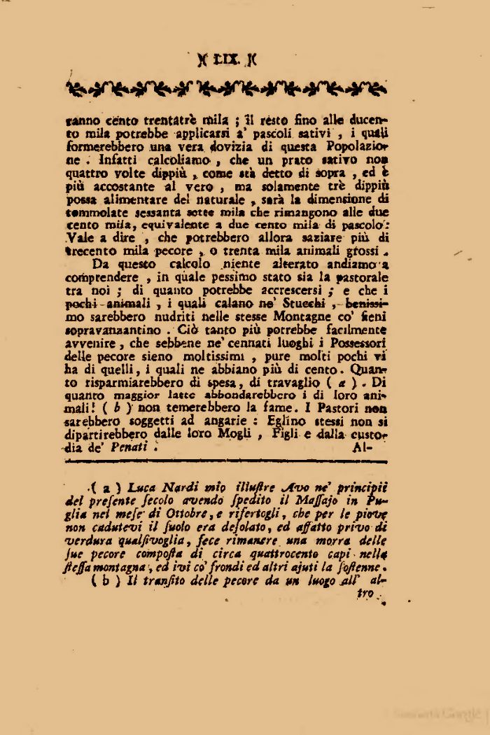 •( a ) Luca Nardi mip illuftre nr' principii del preferite fecola avendo fpedito il Maffajo in Puglia nei mefe' di Ottobre, e rifertogli, che per le piove non cadutevi il fuoio era defolato, ed affatto privo di verdura qualfivoglia, fé cerimanere una morra delle jue pecore compofta di circa quattrocento capi nell4 fleffa montagna, ed ivi co' frondi ed altri ajuti la foftenne.