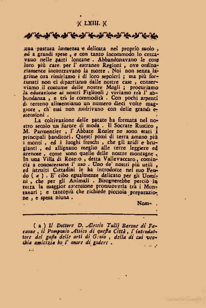 La coltivazione delle patate ha formata nel nostro secolo un furore di moda . Il Socrate Rustico , M. Parmentier , .1' Abbate Rozier ne sono «tati i principali banditori. Questi pomi di terra amano più 1 monti , ed i luoghi freschi , che gli aridi e bru-giantì , ed allignano meglio alle terre leggiere ed arenose , c