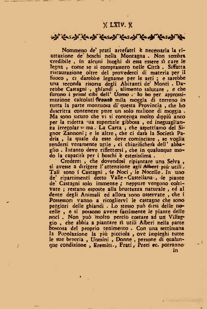Nommeno de' prati artefatti fe necessaria la ri-attazione de' boschi nella Montagna . Non sembra credibile , in alcuni luoghi di essa essere si care le legna , come se si comprassero nelle Città . Siffatta ristaurazione oltre del provederci di materia per il fuoco , ci darebbe legname per le arti ; e sarebbe una seconda risorsa degli Abitanti de1 Monti . Darebbe Castagni , ghi'andi , alimento salutare , e che furono i primi cibi dell' Uomo lo ho per approssimazione calcolati flrenofc mila moggia di terreno ir* tutta la parte montuosa di'questa Provincia , che ho descritta contenere pure un solo milione di moggia . Ma sono sicuro che vi si contenga molto dippiù anco per la ridetta *ua superhzie gibbosa , ed ineguaglianza irregolar s« ma. La Carta , che aspettiamo del Signor Zannoni,- e le altre» che ci darà la Società Padda , la quale da esse deve cominciare , se voglia rendersi veramente u.tìle , ci chiarificherà dell' abbaglio . Intanto deve riflettersi, che in qualunque modo la capacità per i boschi è estesissima .