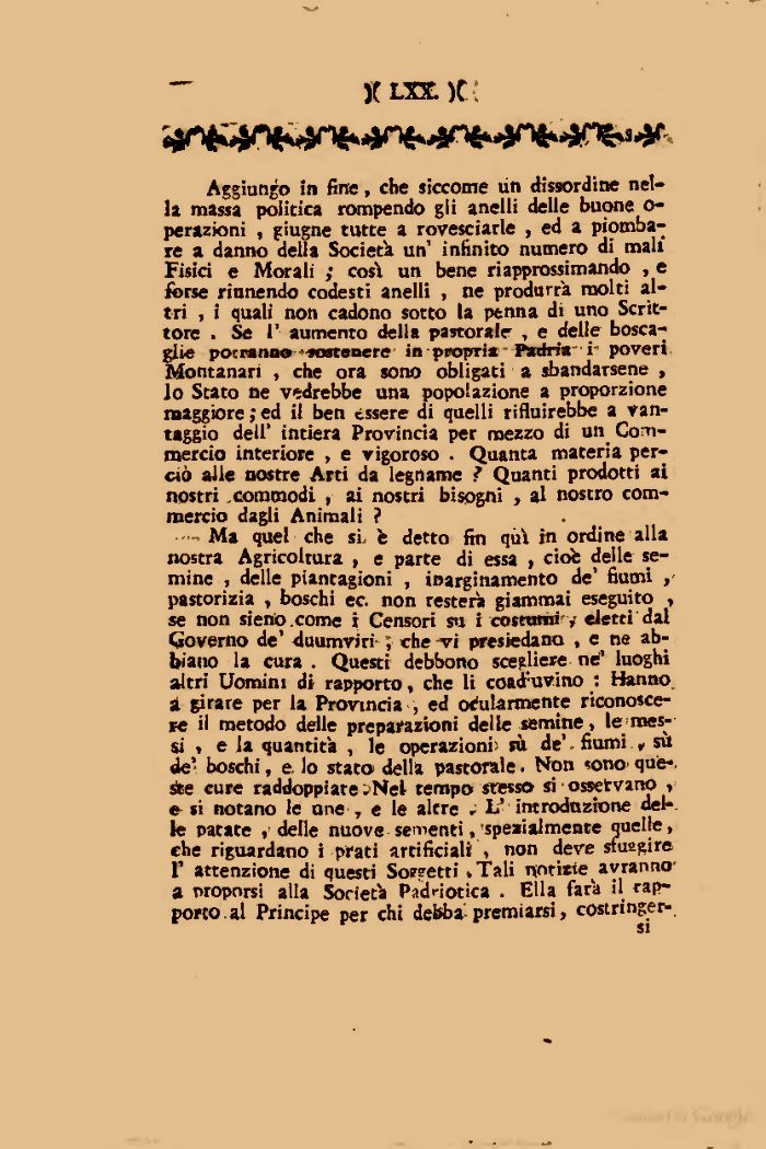 Aggiungo in fine, che siccome un dissordine nella massa politica rompendo gli anelli delle buone o-perazioni , giugne tutte a rovesciarle , ed a piombare a danno della Società un' infinito numero di mali Fisici e Morali ,* cos\ un bene riapprossimando , e forse riunendo codesti anelli , ne produrrà molti altri , i quali non cadono sotto la penna di uno Scrittore . Se 1' aumento della pastorale , e delle boscaglie porranno -«ottenere in propria-Padria i poveri Montanari , che ora sono obligati a sbandarsene , lo Stato ne vedrebbe una popolazione a proporzione maggiore ; ed il ben essere di quelli rifluirebbe a vantaggio dell' intiera Provincia per mezzo di un Commercio interiore , e vigoroso . Quanta materia perciò alle nostre Arti da legname ? Quanti prodotti ai nostri xommodi , ai nostri bisogni , al nostro commercio dagli Animali ?