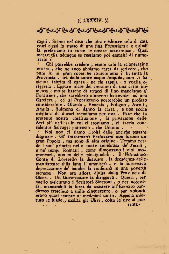 Noi non ci siamo ritolti dalle antiche passate disgrazie . Gì' Interamniti Pretuziani non furono un gran Popolo , ma sono di alra origine., Teramo perde i suoi principi nella notte tenebrosa de* Secoli , e ne1 tempi Romani , come dimostrano i suoi mo-. numenti, non fu delle più-ignobili . Il Normanno Conte di Loretello la distrusse , la decadenza-delle manifatture d'Ila lana I' ammiserì , e la - successiva depredazione de' banditi la confermò in una povertà «trema . Non era allora divisa dalia Provincia di Chieti , Un Governatore la dixiggeva . Questi , per quello assicurano i Scrittori Sincroni , o per necessità, mancandoli la forza da resistere all'Esercito banditesco cresciuto a mille cinquecento, o per volontà erano quasi