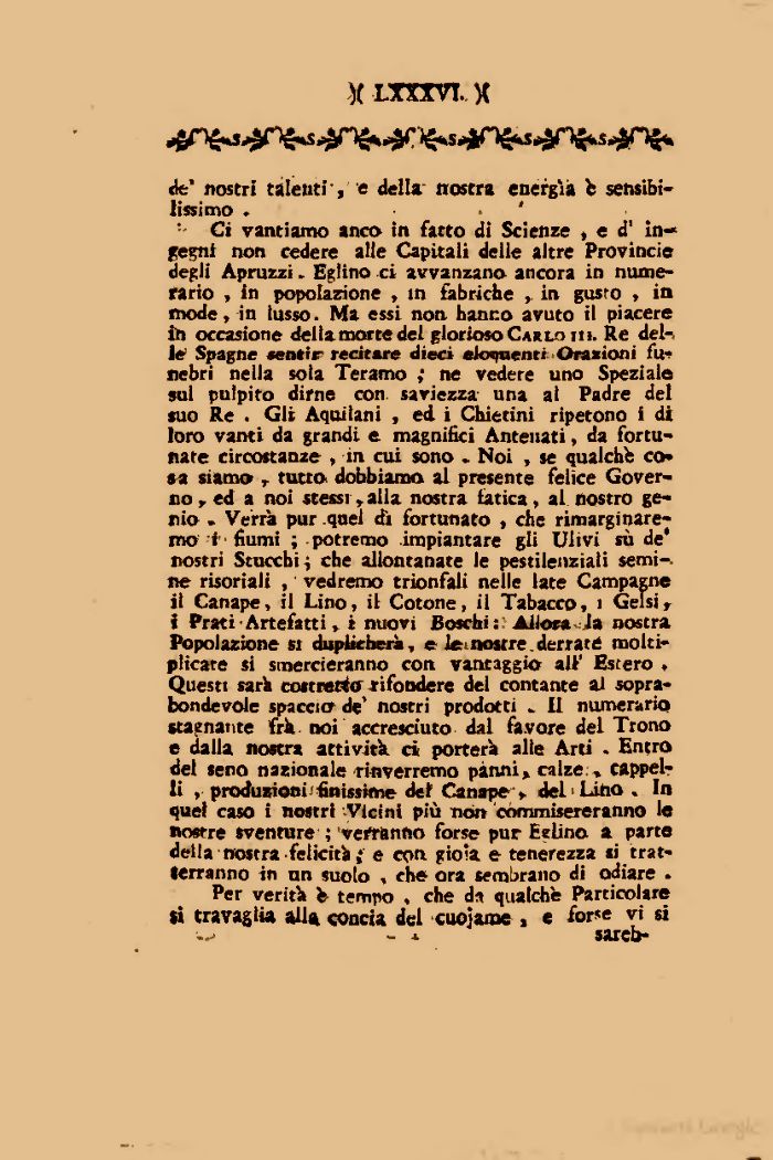 de' nostri talenti', e della nostra energia fe sensibilissimo . ¦ ' '¦¦ Ci vantiamo anco in fatto di Scienze , e d' ingegni non cedere alle Capitali delle altre Provincie degli Apruzzi. Eglino ci avvanzano ancora in numerario , in popolazione , in fabriche y in gusto » ia mode, in lusso. Ma essi non hanno avuto il piacere ih occasione dellamortedel glorioso Carlo in. Re del-, le Spagne sentir recitare dieci eloquenti Orazioni funebri nella sola Teramo ; ne vedere uno Speziale sul pulpito dirne con saviezza una al Padre del suo Re . Gli Aquilani , ed i Chietini ripetono i di loro vanti da grandi e magnifici Antenati, da fortunate circostanze , m cui sono . Noi , se qualchb cosa siamo r tutto dobbiamo al presente felice Governo y ed a noi stessi » alla nostra fatica , al nostro genio - Verrà pur .quel dì fortunato , che rimarginare-mo i -fiumi ; potremo impiantare gli Ulivi sòde' nostri Stucchi; che allontanate le pestilenziali semi-, ne risonali , vedremo trionfali nelle late Campagne il Canape, il Lino, il Cotone, il Tabacco, i Gelsi, I Prati • Artefatti » t nuovi Boschi: Allora la nostra Popolazione si duplicherà, e le.nostre.derrate moltiplicare si smerderanno con vantaggio ali' Estero » Questi sarà costretta rifondere del contante al sopra-bondevole spaccio de' nostri prodotti . Il numerario stagnante frà noi accresciuto dal favore del Trono e dalla nostra attività ci porterà alle Arti . Entro del seno nazionale rinverremo panni» calze. » cappelli , produzioni finissime de! Canape * del Lino . In quel caso i nostri Vicini più non commisereranno le nostre sventure ; veir&nfto forse pur Éelino a parte della nostra felicità ; e con gioia e tenerezza si tratterranno in un suolo , eh* ora sembrano di odiare .