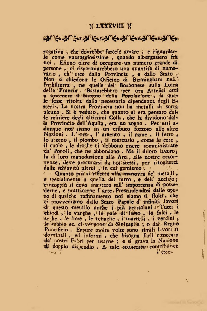 rogatila , Che dovrèbbe' farcele amare , e riguardarle come vantaggiosissime , quando albergassero frii noi . Elleno oltre di occupare-un numero grande di persone , ci risparmiarebbero una quantità di numerario , eh' esce dalla Provincia , e dallo Stato .. Non si chiedono le Officine di Birmingham nell' Inghilterra , ne quelle del Borbonese sulla Loira della Francia' . Baserebbero 'per ora Artefici attr & sostenere il fcisogno della Popolazione , la quale fosse ritolta dalla necessaria dipendenza degli fi-steri La nostra Provincia non ha metalli di sorta alcuna . Si e veduto, che quanto si era pensato delle miniere degli altissimi Colli , che la dividono dalla Provincia-dell'Aquila, era un sogno . Per essi a-dunque noi' siamo in un tributo forzoso alle altre Nazioni . I.' orti', 1' argento , il rame , il ferro t