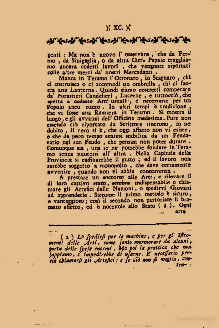 Manca in Teramo l'Ottonare, lo Stagnaro , chi ci costruisca o ci accomodi un ombrella , chi ci faccia una Lanterna. Quindi siamo costretti comperare da' Forastieri Candelieri , Lucerne , e tuttocciò, che spetta a codeste Arti usuali , e' necessarie per un Popolo anco rozzo . In altri tempi b tradizione , che vi fosse una Ramiera in Teramo . Si mostra il luogo, egli avvanzi dell'Officina medesima. Pure non essendo ciò riportato da Scrittore sincrono, io ne dubito , Il vero si è,*che oggi affatto non vi esiste, e che da poco tempo sentesi stabilita da un Feudatario nel suo Feudo , che pensasi non poter durare . Comunque sia , una se ne potrebbe fondare in Teramo senza nuocersi all' altra . Nella Capitale della Provincia si raffinarebbe il gusto ; ed il lavoro non sarebbe soggetto a monopolio , che deve certamente avvenire , quando non vi abbia concorrenza .