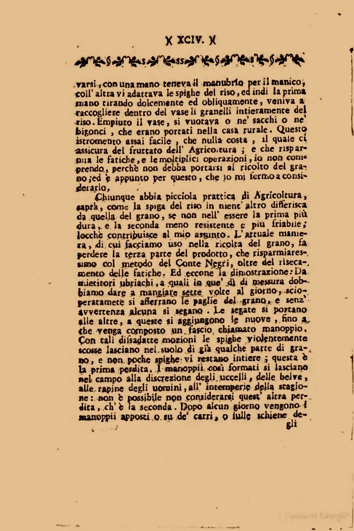 Chiunque abbia picciola pr attica di Agricoltura, «apra , come la spiga del riso in nient'altro differisca da quella del grano, se non nell' essere la prima più dura,, e. la seconda meno resistente e più friabile; Jocchè contribuisce al. mio assunto- L'attuale maniera, di. cui facciamo uso nella ricolta del grano, fa perdere la terza parte del prodotto, che risparmiares-, wmo col jnetodo del Conte ffegri, oltre del riseca-, mento delie fatiche- Ed ecconé la dimostrazione.'Da mietitori ubriachi ,a quali in .que' .di di soessura dob--biamo dare a .mangiate s^tte vplte al giorno,.-scio-peratametè si afferrano fe paglie del -grano, e senz' avvertenza alcuna si segano . Le «egate si portano alle altre, a queste si aggiungono le nuove ,.fino the venga composto un . fascio, chiamato roanoppio. Con tali difsadatte mozioni le spighe violentemente scosse lasciano nel, suolo ..di già qualche parte di gra-t no, e non, poche spighe-vi restano intiere j questa b la prima perdita. 1 manoppii -cosi formati si lasciano nel campo alla discrezione degli, uccelli, delle belve, alle,, rapine degli uomini, all' intemperie della stagione :. non fe possibile non .considerarsi quest' altra per-, dita, .eh' b la seconda. Dopo alcun giorno vengono I manoppii apposti o.«u de' carri, q iullc schiene de-