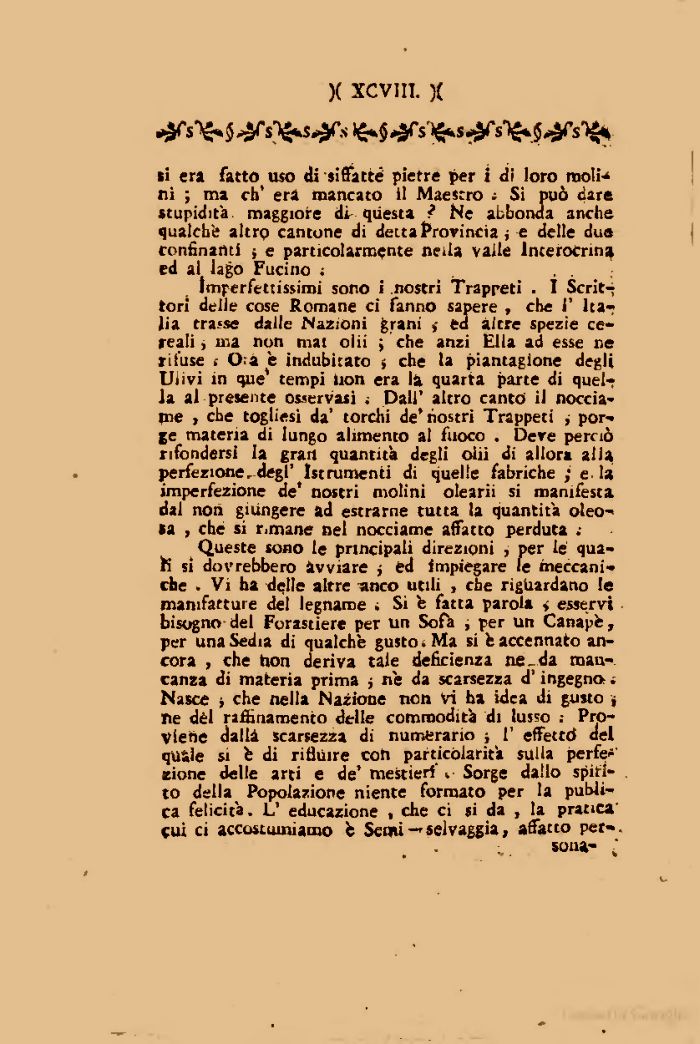 Queste sono le principali direzioni , per le quali si dovrebbero avviare ; ed impiegare le meccaniche . Vi ha delle altre anco utili , che riguardano le manifatture del legname ; Si fe fatta parola > esservi bisogno del Forastiere per un Sofà , per un Canapé, per una Sedia di qualche gusto .Ma si fe accennato ancora , che hon deriva tale deficienza ne_da mancanza di materia prima j ne da scarsezza d'ingegno ; Nasce > che nella Nazione non vi ha idea di gusto j ne dèi raffinamento delle commodità di lusso Proviene dalla scarsezza di numerario } V effetti del quale si fe di rifluire coh particolarità sulla perfezione delle arti e de' mestieri i Sorge dallo spirito della Popolazione niente formato per la pubii-ca felicità. L' educazione , che ci si da , la pratica* cui ci accostumiamo fe Semi-'selvaggia, affatto per-.