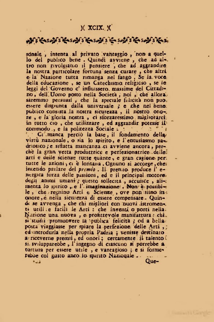 Ci .manca perciò la base, il fondamento dell^ virtù Jiazaonale, o sia lo spirito, e l'entusiasmo pa-«. driGtico;e sitlatta mancanza-ci avviene ancora , perchè la gran yetta produttrice e perfezionatrice-.dtilei arti e delle scienze tutte quante -» e gran cagione, per: tutte le azioni > ci fe lontana , Ognuno si accorge, eh e; intendo pailare del premio . Il- premi© produce 1' e-nergica iorza delie passioni, ed e il principai motore-dcé1! animi umani ; questo sollecita , accuisce , ali-: menta io spirito ».e 1' imaginazione', Non èi possibi-s le , che regnino Arti c Scienze , ove jion siino in-, onore , é. nella sicurezza di essere compensate . Quindi se avvenga ,. che chi migliori con nuovi .istromen*. ti utili:e facili le Arti : che inventi o porti nella, i fazione una. nuova , e-profittevole manifattura .- chi.