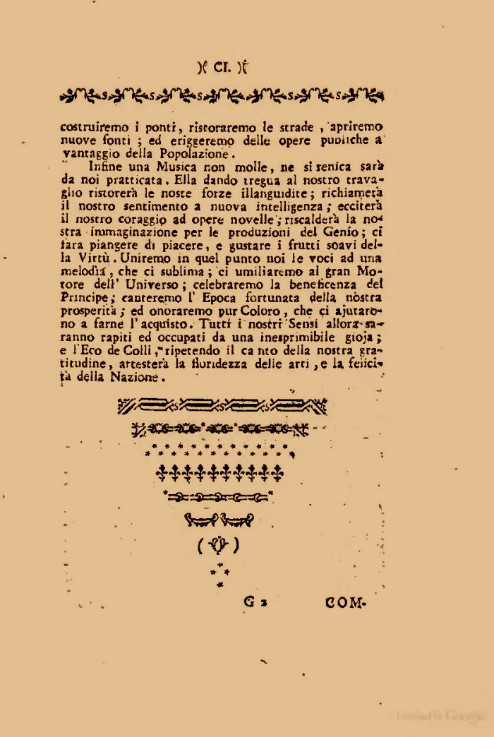 Infine una Musica non molle, ne sirenica sarà da noi praticata. Ella dando tregua al nostro travaglio ristorerà le noste forze illanguidite; richiamerà il nostro sentimento a nuova intelligenza ; ecciterà il nostro coraggio ad opere novelle ; riscalderà la ncH stra immaginazione per le produzioni del Genio; ci tara piangere di piacere, e gustare i frutti soavi della Virtù. Uniremo in quel punto noi le voci ad una melodìa, che ci sublima ; ci umiliartm© al gran Motore dell' Universo ; celebraremo la beneficenza del Principe; canteremo 1' Epoca fortunata della nòstra prosperità; ed onoraremo pur Coloro, che ci aiutarono a farne 1'acquisto. Tutti i nostri Sensi allora-sapranno rapiti ed occupati da una inesprimibile gioja ; e l'Eco de Colliripetendo il canto della nostra gratitudine, attesterà la floridezza delie arti ,e la felici-* jà della Nazione.