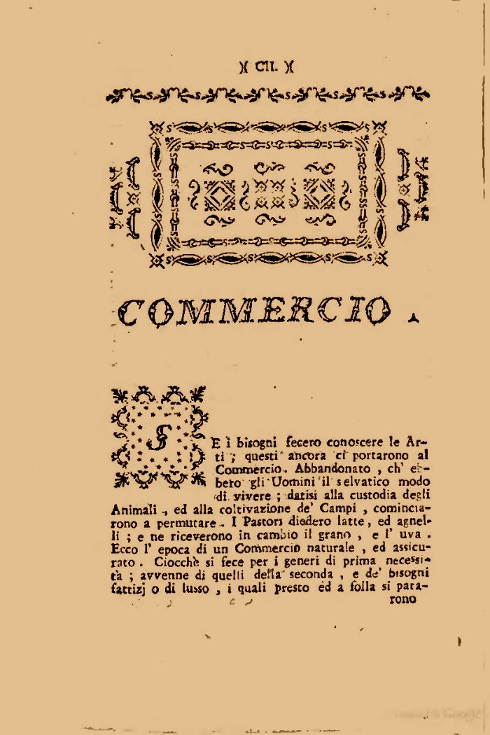 <;V O* % E i bisogni fecero conoscere !e Ar-£ « * l ìJf ti 7 questi ancora ci portarono al ^.^^T.^r £ Commercio. Abbandonato , eh1 eb-X3'5 beto gli'Uomini'il selvatico modo ¦di. vivere ; datisi alla custodia degli Animali -, ed alla coltivazione de' Campi , cominciarono a permutare.. I Pastori diedero latte, ed agnelli ; e ne riceverono in cambio il grano , e 1* uva . Ecco 1* epoca di un Commercio naturale , ed assicurato . Ciocchi; si fece per i generi di prima neceJsi* t'a ; avvenne di quelli della' seconda , e de' bisogni {attizj o di lu»so , i quali presto ed a folla si para-