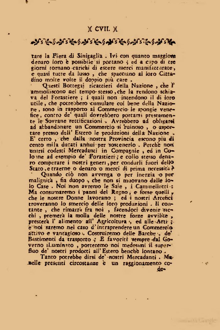 Quando ciò non avvenga o per inerzia o per malignità , fia duopo <, che non si muovano dalle lo» lo Case ¦ Noi non avremo le Saie , i Cammellotti ••: Ma consumaremo i panni del Regno, e forse quelli , che le nostre Donne lavorano ; ed i nostri Artefici troveranno lo smercio delle loro produzioni . Il contante , che rimarrà fra noi , facendoci divenir ricchi , premerà la molla delle nostre forze avvilite , presterà 1' alimento all' Agricoltura •, ed alle-Arti1 ; è''noi saremo nel caso d'intraprendere un Commercio attivo e vantagfoso >. Costruiremo delle Barche -, de* Bastimenti da trasporto ,* £ favoriti -sempre dal Governo ìl.umìnsto , porteremo noi medesimi il superfluo de' nostri prodotti all' Estero benché lontano..