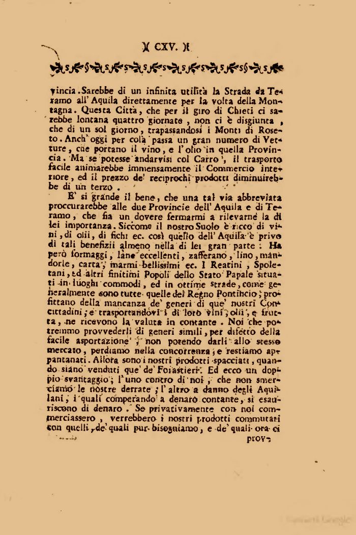 E' si grande il bene, che una tal via abbreviata proccurarebbe alle due Provincie dell'Aquila e di Te* ramo, che fi a un dovere fermarmi a rilevarnd la di lei importanza. Siccome il nostro Suolo fe ricco di vi*-ni, di olii, di fichi ec. cosi quello dell' Aquila-'è privo di tali benefizi! almeno nella di lei gran parte : Ha però formaggi, lane'eccellenti, zafferano, lino , màn^ dorle, cartaV marmi-bellissimi ec. 1 Reatini , Spole-tani, td altri finitimi Popoli dello Stato Papale situati-in > luoghi commodi, ed in ottime strade,eom'e: generalmente sono tutte' quelle del Regno Pontihciojpro^ fittano della mancanza de' generi di que' nostri Con* Cittadini ; e- trasportandoti i dì lorò ^ini y olii e frutta, .ne ricevono la'valuta in contante . Noi che poliremmo provvederli di generi simili,per difetto della facile asportazione' non potendo darli allo stesso mercato, perdiamo nella concorrenza j e restiamo apr pantanati. Allóra sono i nostri prodotti spaccia» , quando siano'venduti que' de' FoiastierK Ed ecco un dopL pio svantaggio; l'uno contro di noi , che non smerciamo- le nòstre derrate ; 1' altro a danno degli A qui», lanii'quali comperando1 a denaro contante, si esauriscono di denaroV Se privativamente con noi com-jtnerciassero , verrebbero i nostri prodotti commutati «on quelli rde' quali pur- bisogniamo, e de' qaali- ora- ci