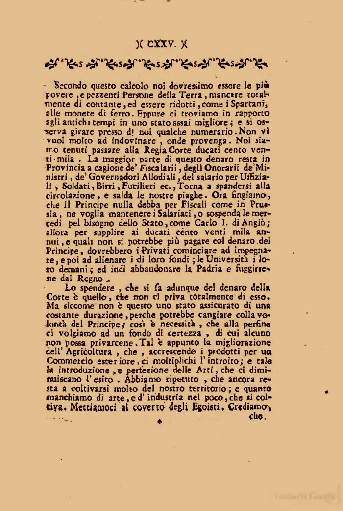 Lo spendere , che si fa adunque del denaro della Corte h quello, die non ci priva totalmente di esso. Ma siccome non è questo uno stato assicurato di una costante durazione, perche potrebbe cangiare colla volontà del Principe; così e necessità , che alla perfine ci volgiamo ad un fondo di certezza , di òli alcuno non possa privarcene .Tal è appunto la migliorazione dell' Agricoltura , che , accrescendo i prodotti per un Commercio esteriore,ci moltiplichi l'introito; e tale la introduzione ,e perfezione delle Arti, che ci diminuiscano l'esito . Abbiamo ripetuto , che ancora resta a coltivarsi molto del nostro territorio; e quanto manchiamo di arte,ed' industria nel poco,che si coltiva» Mettiamoci al coverto degli Egoisti, Crediamo,