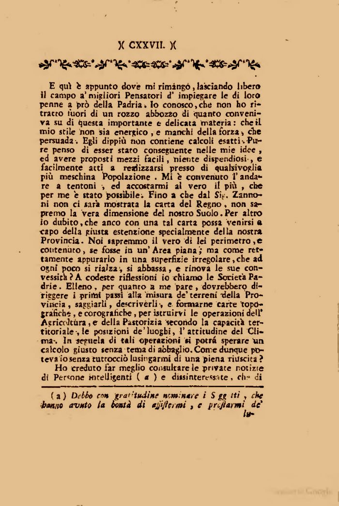 E qui fc appunto dovè mi rimingó, lasciando libero il campo a' migliori Pensatori d' impiegare le di loro penne a prò della Padria. Io conosco,che non ho ritratto fuori di un rozzo abbozzo di quanto conveniva su di questa importante e delicata materia: cheti mio stile non sia energico , e manchi della forza* che persuada . Egli dippiù non contiene calcoli esatti % Pure penso di esser staro conseguente nelle mie idee , ed avere proposti mezzi facili, niente dispendiosi', e facilmente atti a realizzarsi presso di qualsivoglia più meschina Popolazione . Mi è convenuto l'anda*-re a tentoni , ed accostarmi al vero if più , che per me e stato possibile; Fino a che dal Si}.'. Zanno-ni non ci sarà mostrata la carta del Regno, non sapremo la Vera dimensione del nostro Suolo. Per altro io dubito, che anco con una tal carta possa venirsi a capo della giusta estensione specialmente della nostra Provincia- Noi sapremmo il vero di lei perimetro,e contenuto, se fosse in un'Area piana,' ma come rettamente appurarlo in una superficie irregolare, che ad ogni poco si rialzav si abbassa, e rinova le sue convessità ? A codeste riflessioni io chiamo le Società Pa-drie . Elleno , per quanto a me pare , dovrebbero di-riggere i primi passi alla 'misura de' terreni -delia Provincia , saggiarli, descrivèrli e formarne carte topografiche , e corografiche , per istruirvi le operazioni dell* Agricoltura >e della Pastorizia secondo la capacità territoriale-, le posizioni de'luoghi, l'attitudine del Clima-. In sepuela di tali operazioni si potrà sperare *in calcolo giusto senza tema di abbaglio. Come dunque poteva io senza tuttocciò lusingarmi ai una piena riuscita ?